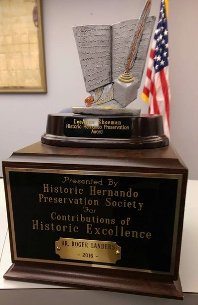 The Lee Anne Shoeman Preservation Award is presented by the Historic Hernando Preservation Society annually to a person who as contributed to understanding of the historic significance of Hernando County, or furthering historic education in Hernando County. It is named in honor of local historian LeeAnne Shoeman and serves as a beacon of hope that the work of Ms. Shoeman will carry on with those of us who love history and wish to continue the memory of a beloved historian, writer and educator. The award is displayed in Brooksville City Hall.