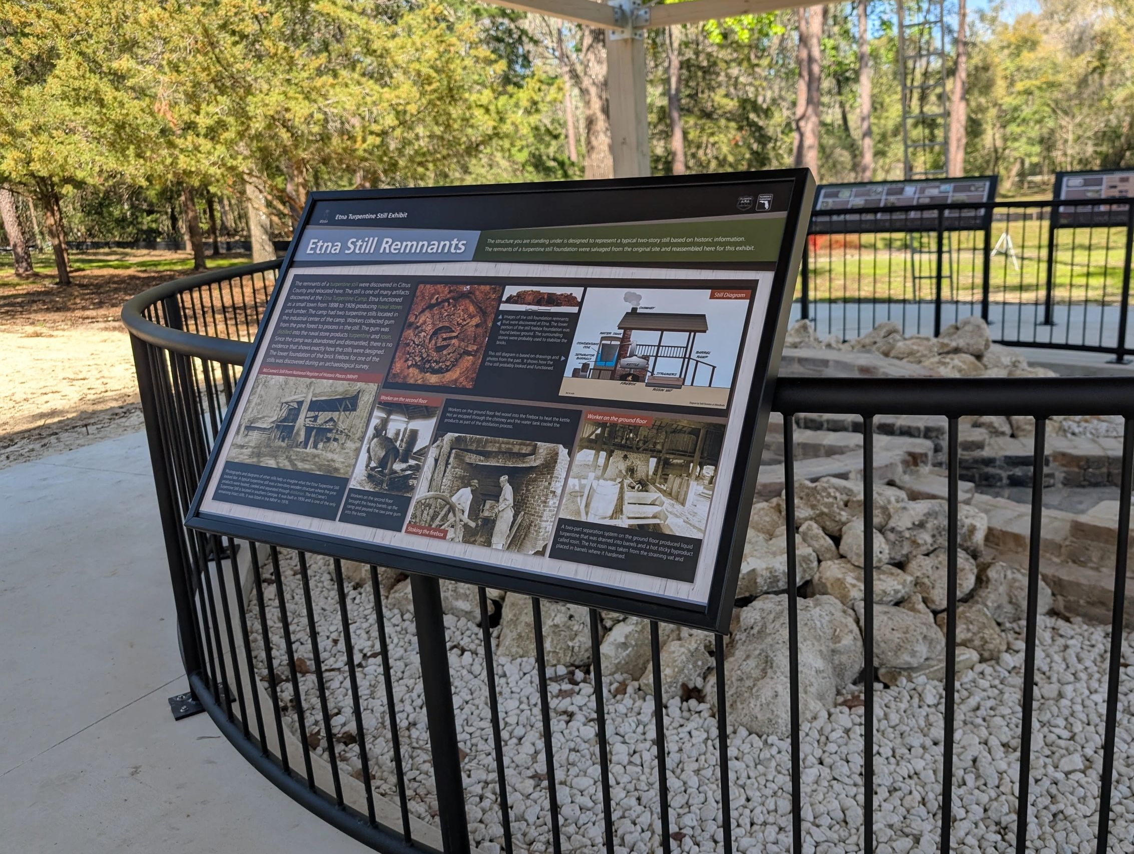 The recently opened historic exhibit explores the story of Etna, a turpentine and lumber camp that existed from 1898 to 1926 in what is now the Withlacoochee State Forest. The display features a relocated turpentine still foundation and interpretive panels that tell the story of the industry and the people.